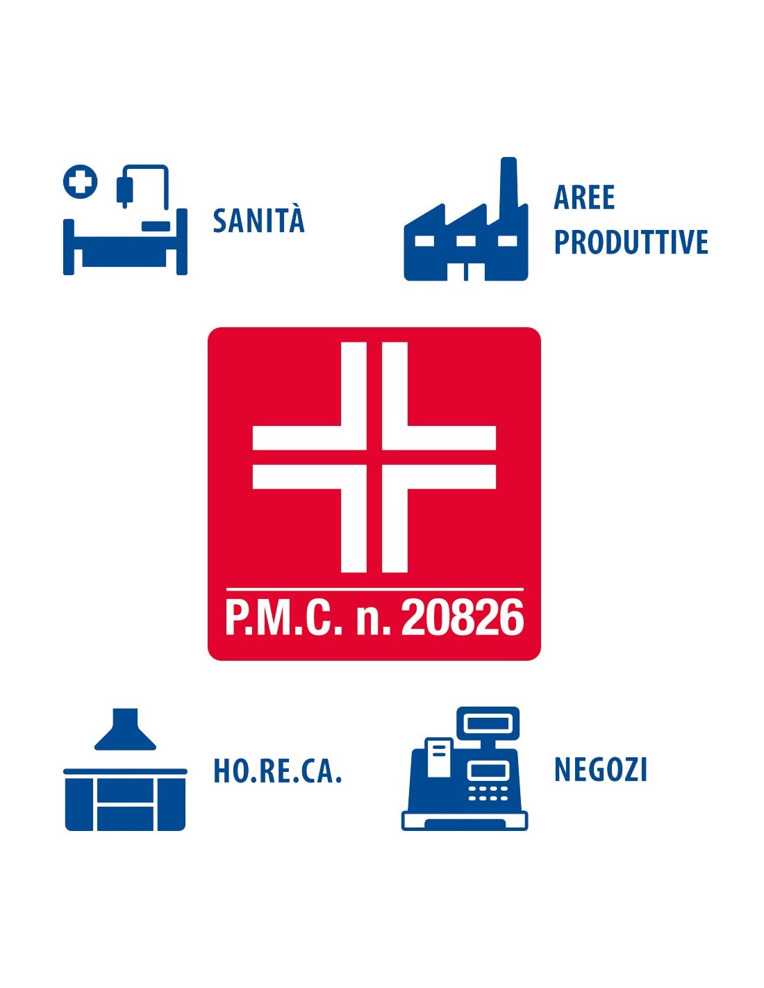 Prodotto PMC (Presidio Medico Chirurgico) conforme alle normative vigenti per la disinfezione di superfici.