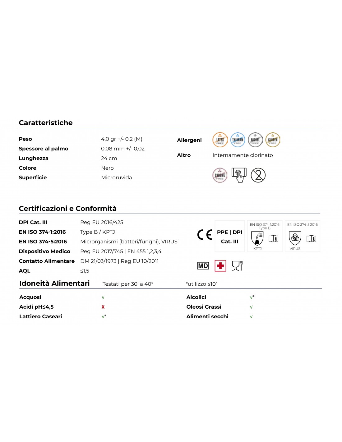 Guanti realizzati in nitrile di alta qualità, completamente 100% senza lattice e privi di silicone, progettati per garantire protezione affidabile contro agenti chimici e microrganismi. Certificati come DPI Cat. 3 e conformi alle normative EN ISO 374-1 TYPE B ed EN ISO 374-5 VIRUS, offrono una barriera efficace contro batteri, funghi e virus, risultando idonei anche come Dispositivo Medico per uso ospedaliero e dentale (AQL ≤1,5). Inoltre sono certificati MOCA, quindi adatti al contatto con diverse tipologie di alimenti. -