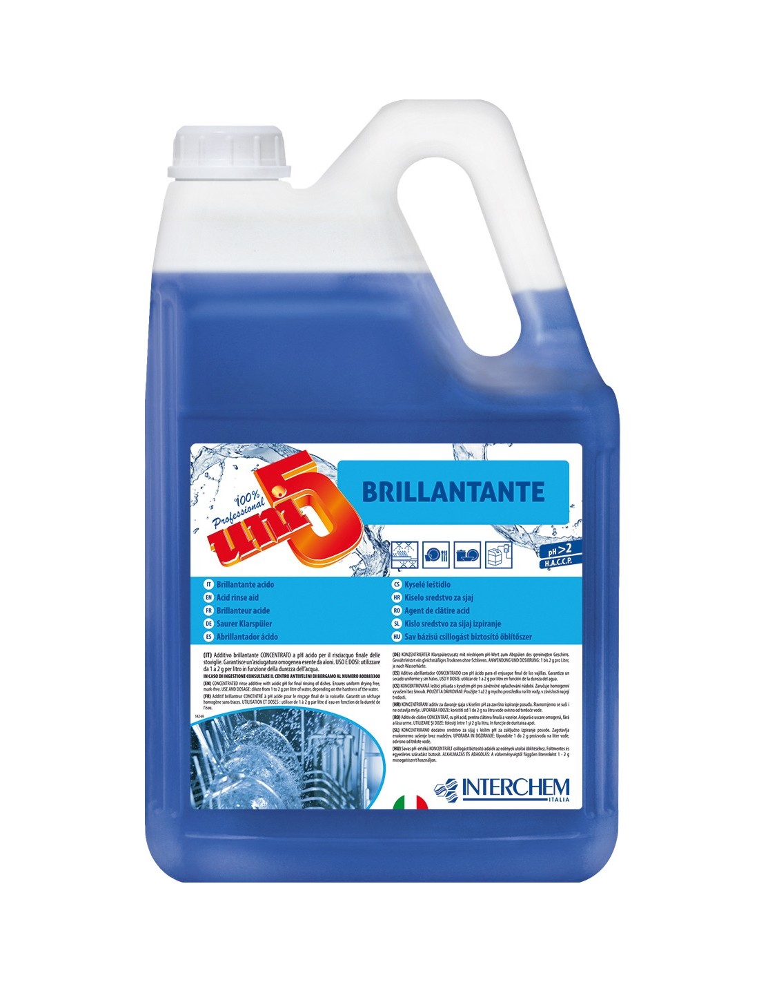 Il Brillantante Lavastoviglie 5 kg è un additivo brillantante acido studiato per l’impiego in macchine lavastoviglie e lavatazzine professionali, ideale per garantire stoviglie perfettamente brillanti, prive di aloni e residui. La sua formulazione specifica è progettata per migliorare sensibilmente il risultato finale del lavaggio, valorizzando l’aspetto di bicchieri, piatti, posate e tazze anche dopo cicli di lavaggio intensivi.